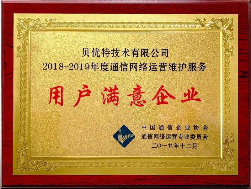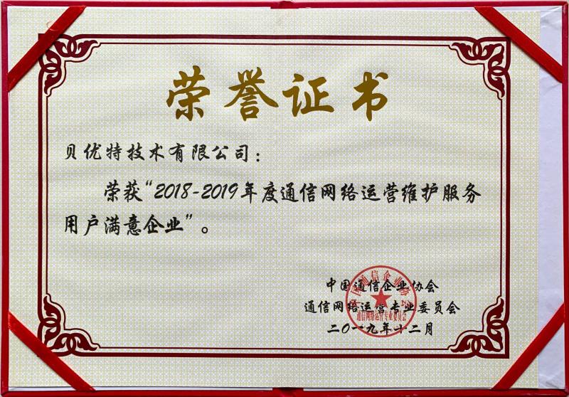 在這辭舊迎新之際,公司喜獲由中國通信企業協會、中國通信網絡運營專業委員會頒發的”2018-2019通信網絡運營維護服務用戶滿意企業“的榮譽獎牌及證書。